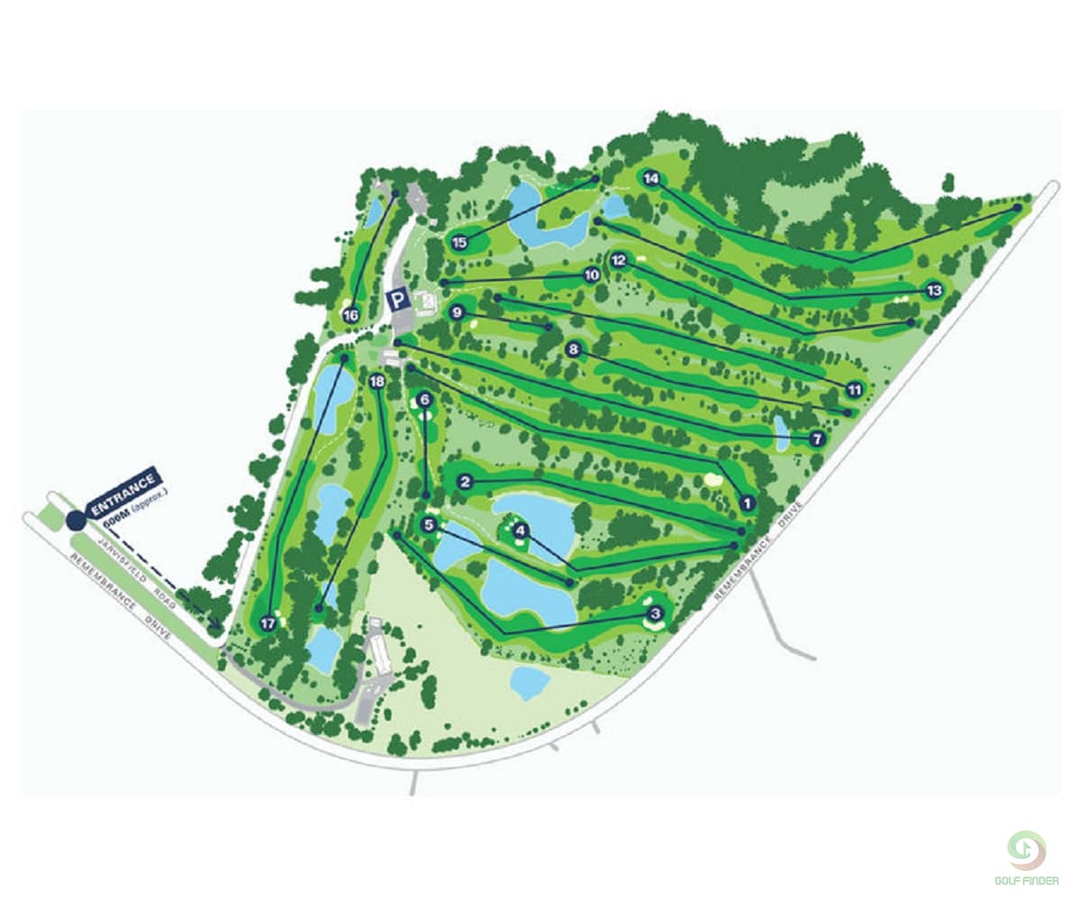 - Course Terrain: A Few Gentle Hills, Water Hazards, Moderate Bunkers (10-20), Tree-lined, Grass Greens, Easy Walking