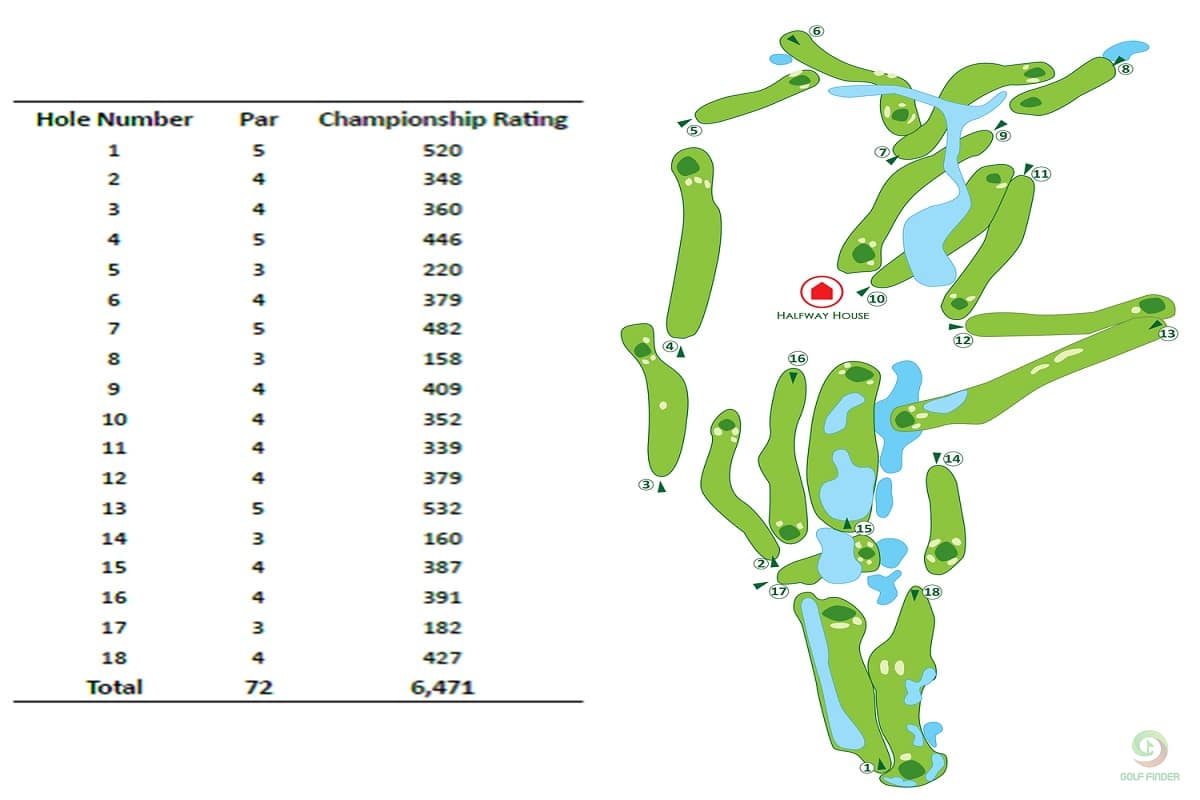 • Terrain: Gentle Undulations, Water Hazards, Heavily Bunkered (20+), Tree-lined, Fairway Watering, Grass Greens, Easy Walking