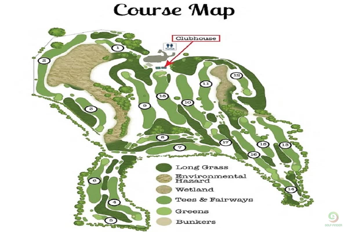 - Terrain: Hilly, Wetlands Hazards, Moderate Bunkers (10-20), Links Style, Fairway Watering, Grass Greens