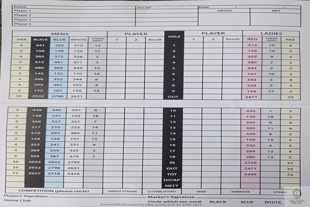 • Course Length: Blue: 5957m, Blue: 5718m, White: 5416m, Red: 5200m