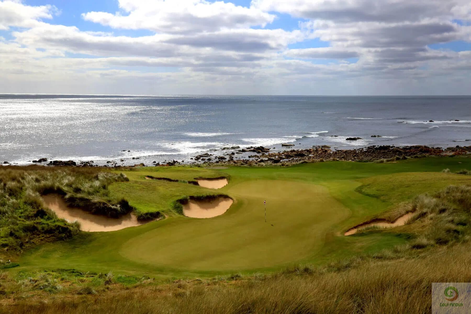 Terrain: Undulating ground, water hazards, heavily bunkered (20+), links style, coastal breezes, fairway watering, grass greens